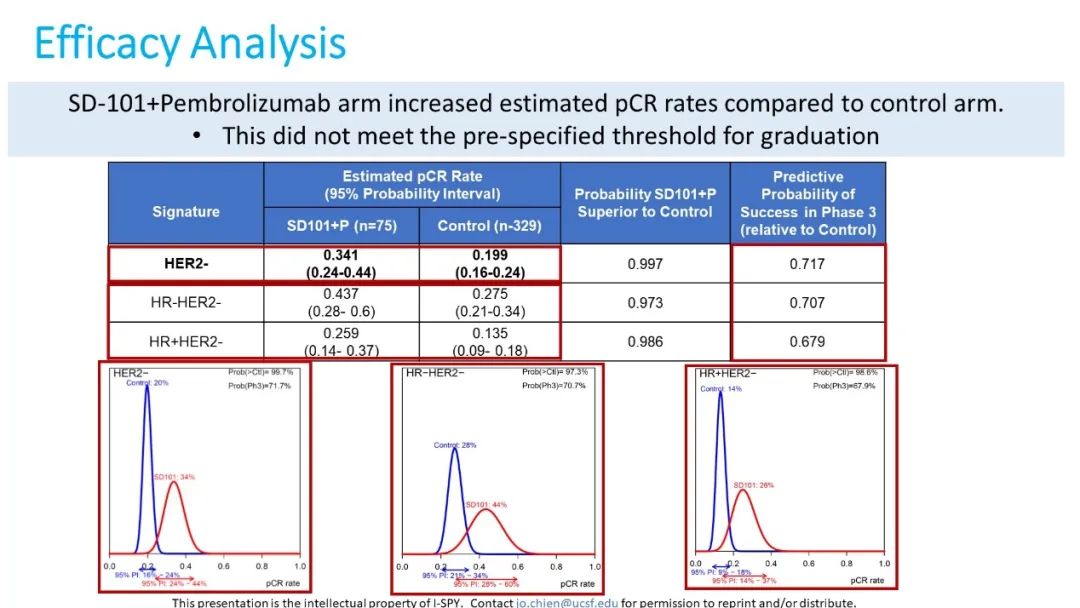 该研究有75例患者被分配到SD-101+Pb组,329例历史病例组成对照组。由于研究组纳入患者人数到达最大值而研究已中止。两组患者的基线特征未见显著差异,SD-101+Pb组中HR+和HR-患者占比分别为61%和39%。所有HER2-患者中,SD-101+Pb组的估计pCR率(Estimated pCR rate)为34.1%高于对照组的19.9%,HR-和HR+人群的估计pCR率为43.7%和25.9%(图3)。但是,在这三组人群中预测Ⅲ期成功率均低于85%的目标阈值,HER2-人群预测成功率仅为71.7%。