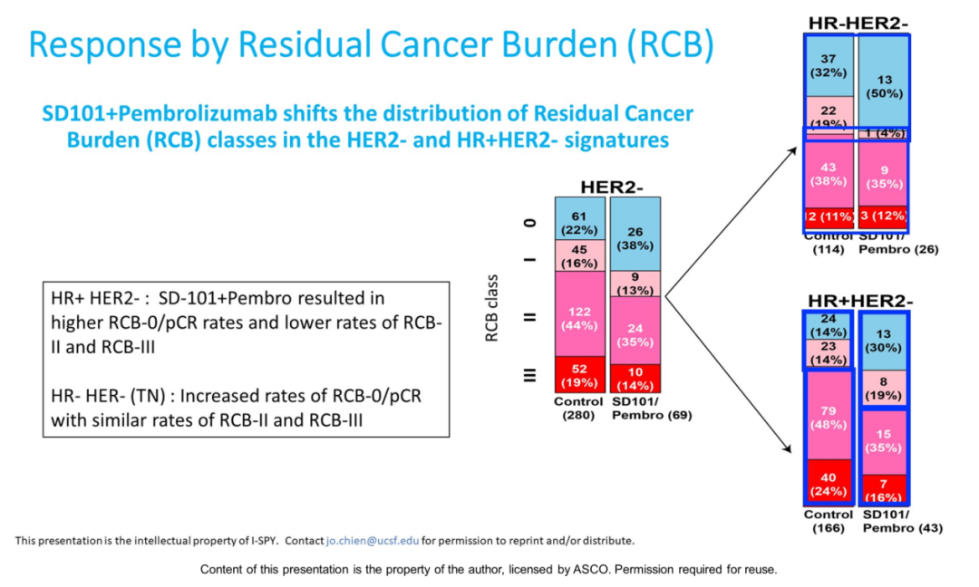 通过SD-101+Pb的治疗,HR+/HER2-患者中残留肿瘤负荷=0(RCB0)/pCR和RBC1出现了较明显的增加,RCB0和RCB1为49%,对照组为28%(图4)。