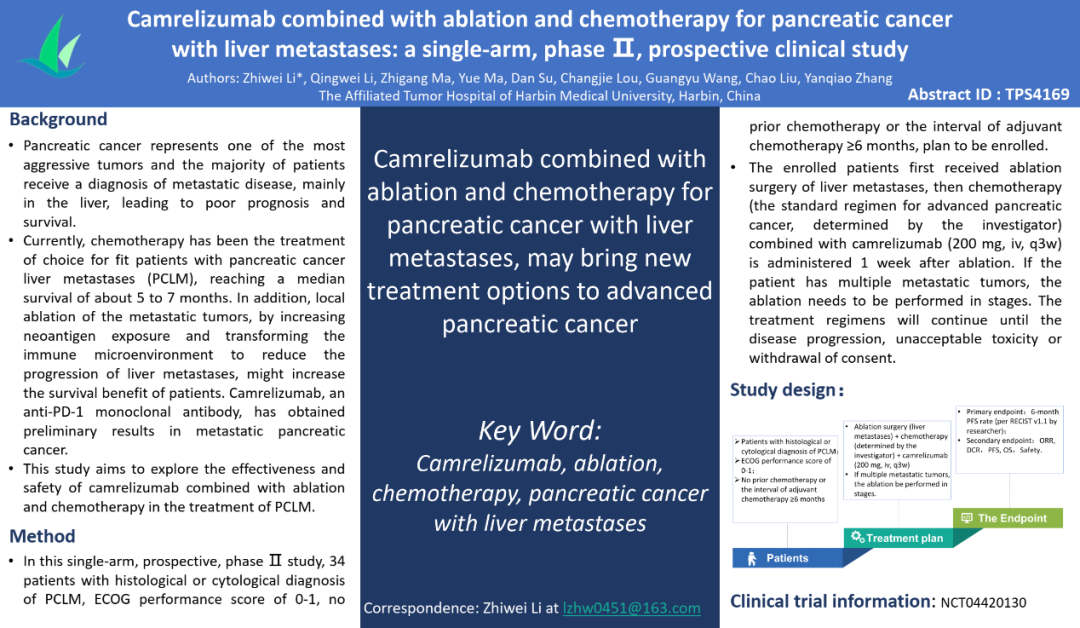 编者按:胰腺癌是具有极强侵袭性的恶性肿瘤,手术切除是唯一可治愈胰腺癌的治疗方式,但大多数患者发现时已有远处转移,其中以肝脏转移最为常见,从而丧失了手术机会。目前晚期胰腺癌的治疗策略仍然是以化疗为主的综合治疗,然而几种化疗药物单独或联合使用,无法进一步改变胰腺癌死亡率高的现状,转移性胰腺癌患者的中位生存期不到1年,因此亟需探索新的治疗模式改变目前的治疗现状。随着局部治疗手段和免疫治疗的发展,以胰腺癌综合治疗为核心的多种治疗手段联合应用得到广泛关注,这有望进一步改善胰腺癌患者的整体预后。张艳桥教授团队发起的卡瑞利珠单抗联合化疗和消融治疗胰腺癌肝转移的临床研究在2021年ASCO年会上以壁报的形式进行展示(Abstract:TPS4169),《肿瘤瞭望》和“肿瘤瞭望-消化时讯”特邀哈尔滨医科大学附属肿瘤医院张艳桥教授、李志伟教授对该研究进行了介绍及点评。