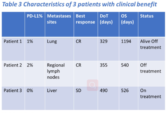 结果:该研究共收入了28位mTNBC患者,18例(64.3%)为PD-L1阴性肿瘤。中位年龄为54岁(34~78岁)。既往化疗中位线数为2(0~6),其中8例(28.6%)接受超过三线化疗,3例(10.7%)有脑转移。6例(21.43%)患者有临床获益,2例CR(7.1%)、1例PR(3.57%)和3例SD(10.7%)。临床获益患者存在持久性,中位DoT为383天(195~1195天)。