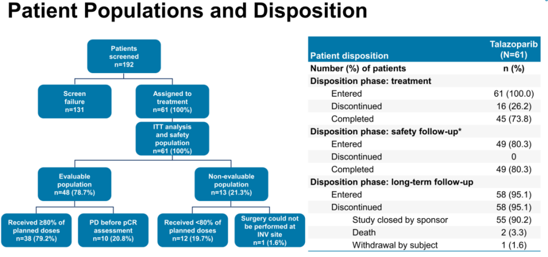 研究方法:该研究采用TALA对早期胚系突变HER2-乳腺癌进行新辅助治疗。入组T>1.5cm,N0-3M0患者,TALA常规剂量为1mg(中度肾功能损伤0.75mg),每日一次口服。完成24周新辅助治疗后进行手术。主要研究终点为独立中心评估(ICR)的病理完全缓解率(pCR),次要研究终点为研究者评估(INV)的pCR以及残余肿瘤负荷(RCB)。可评估人群包括接受至少80%TALA剂量并完成乳腺手术可评估的pCR患者,同时加上部分在评估pCR前进展的患者。ITT人群包括所有接受至少一次TALA的患者。