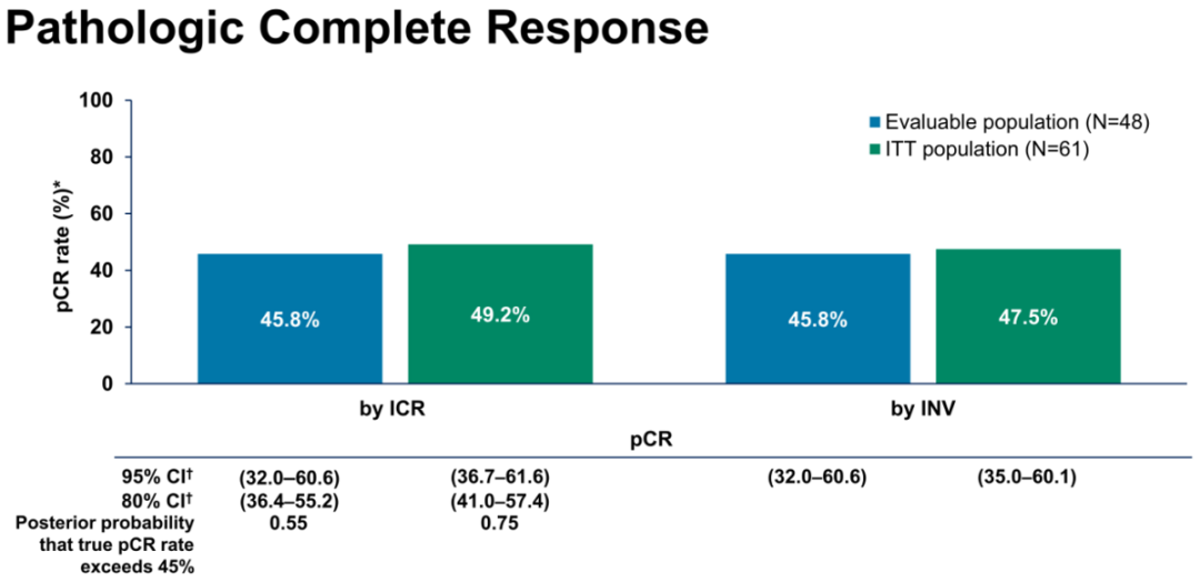 可评估人群和ITT人群的pCR和RCB如下图所示。可评估人群pCR by ICR vs ITT人群pCR by ICR:22(45.8%) 95%CI:32.0~60.6 vs 30(49.2) 95%CI:36.7~61.6。