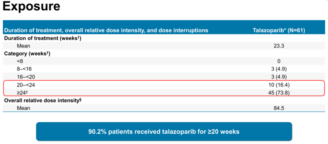 10例(16.4%)患者因疾病进展停止研究治疗。1例患者因为新冠疫情限制停止治疗。2例患者因为其他原因提早手术退出研究。9例患者接受药物的剂量<80%。98.4%患者报告治疗相关不良反应:1级27.9%,2级23%,3级45.9%,4级1.6%。其中最严重的是乏力、恶心和脱发。