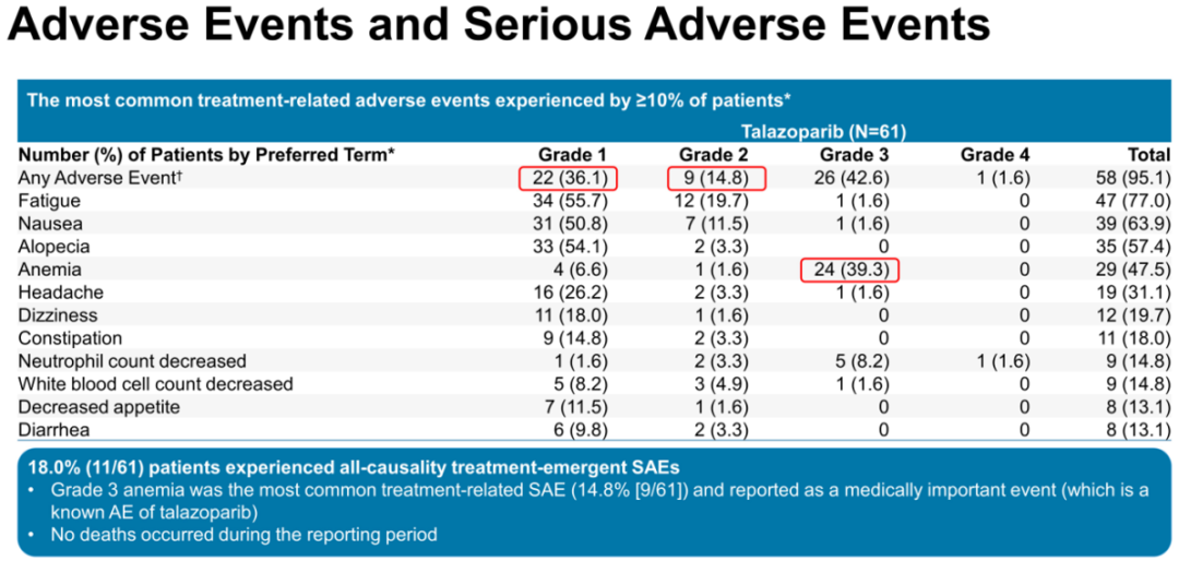 研究结论:TALA单药作为具有BRCA胚系突变的HER2-乳腺癌的新辅助治疗方案,其pCR率与蒽环紫杉联合方案pCR率相当,且耐受性良好。