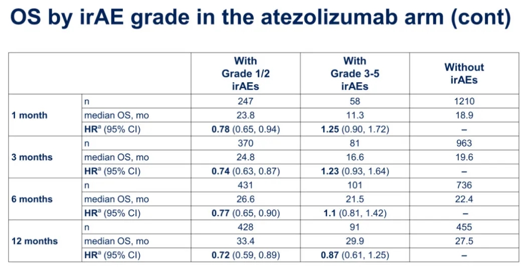 生存分析表明,在阿替利珠单抗组中,1/2级 irAEs 的患者具有最长的OS,3-5级irAE患者OS最短,比经历1-2级irAEs或根本没有irAEs的阿替利珠单抗治疗的患者更短,可能是由于治疗中断/停止所致。在阿替利珠单抗治疗的3-5级irAE患者(与那些没有irAE的患者相比)中,1、3、6和12个月OS的HRs范围为1.25~0.87。相比之下,1-2级irAE患者在HR范围为0.78~0.72。
