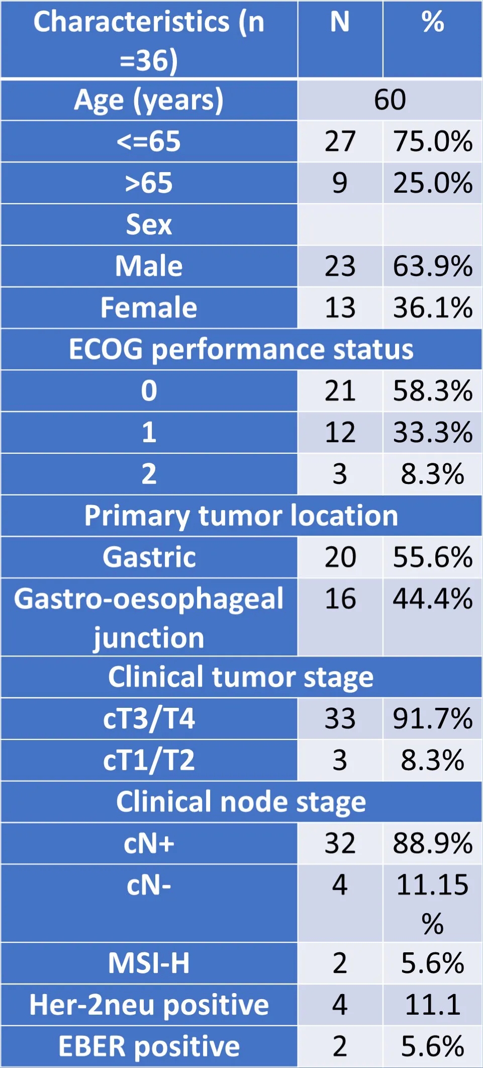 来自天津医科大学肿瘤医院的Gastrimm-001研究是一项由研究者发起的单臂Ⅱ期临床研究,旨在探索特瑞普利单抗联合FLOT方案围手术期治疗可切除的胃及胃食管结合部腺癌的主要病理缓解率及3年无病生存率。研究对36例可切除的进展期(>T2或N+)胃癌或胃食管结合部腺癌,术前给予4周期特瑞普利联合FLOT方案化疗,术后再给4周前特瑞普利联合FLOT方案化疗。入组患者的平均年龄60岁,其中T3/T4患者占91.7%,N+患者占88.9%(表1)。术前术后分别给予4周前特瑞普利联合FLOT方案(每一周期化疗前给予特瑞普利单抗240 mg,d1;多西他赛50mg/m2,d1;氟尿嘧啶2600 mg/m2,d1,持续泵入24小时;亚叶酸钙200 mg/m2,d1;奥沙利铂85 mg/m2,d1)。主要研究终点包括主要病理缓解率(MPR)及3年无病生存率(DFS),次要终点包括病理完全缓解率、安全性、有效率、3年及5年生存率。至2021年2月共有36例患者入组,其中2例患者治疗后拒绝手术治疗,6例患者尚未完成术前治疗。28例完成手术的患者术后病理显示有7例达到完全病理缓解(TRG1a),5例接近完全病理缓解(TRG1b),主要病理缓解率42.9%(表2)。常见不良事件包括厌食、恶心、乏力贫血等,其中3级以上的不良事件中性粒细胞减少(30.6%)、白细胞减少(25.0%)及贫血(5.6%)等(表3)。研究结果初步显示FLOT方案联合特瑞普利单抗围手术期治疗可切除的胃或胃食管结合部腺癌进一步提高了病理缓解率及主要病理缓解率,为进一步提高无病生存奠定了基础。联合方案并没有明显增加不良反应及手术并发症。