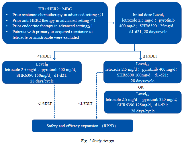 入选符合一线或二线治疗的HR+/HER2+MBC患者,口服来曲唑、吡咯替尼和新型CDK4/6抑制剂SHR6390(达匹西利)。在“3+3”剂量探索阶段,来曲唑以2.5mg/d的固定剂量给药。吡咯替尼和SHR6390(达匹西利)最初分别以400 mg/d和125 mg/d的剂量给药(Ⅰ级;剂量组A)。如果初始剂量水平可以耐受,随后的患者被分配到更高的水平(H级),吡咯替尼400 mg/d和SHR6390(达匹西利)150 mg/d(剂量组B);否则,同时使用吡咯替尼 400 mg/d和SHR6390(达匹西利) 100 mg/d 的L1级水平(剂量组C)或使用吡咯替尼320 mg/d和SHR6390(达匹西利)125 mg/d的L2级水平(剂量组D)。Ⅰb期的主要终点包括剂量限制性毒性(DLT)、最大耐受剂量(MTD)、推荐的2期剂量(RP2D)、安全性和有效性。