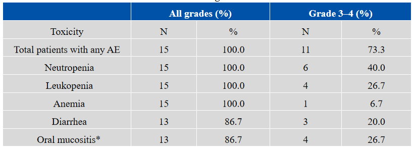 研究中TEAE发生率为100%,常见血液学AE为WBC及ANC计数降低、贫血;非血液学AE为腹泻、口腔黏膜炎。≥3级TRAE发生率73.3%,常见AE为Ⅲ级ANC计数降低、Ⅲ级白细胞计数降低、Ⅲ级口腔黏膜炎和Ⅲ级腹泻。发生1例SAE,发生率6%,为Ⅲ级颅内出血,与研究药物可能无关。此外,我们还进行了药代动力学和患者安全性的统计,相关结果以后会进行披露。