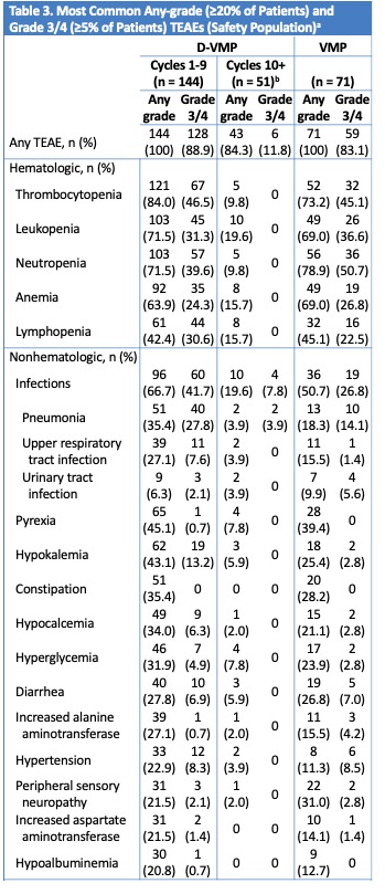 表1总结了研究中观察到的最常见的任意等级治疗相关AE (两组中均在≥20%的患者中观察到)以及最常见的 3/4级TEAEs (两组中均在≥5%以上的患者中观察到)。从第一个疗程到第9个疗程,D-VMP 组有43.8%的患者发生了sAE,VMP组有35.2%的患者发生sAE。输注相关反应(IRRs)在30.6%接受DARA输注的患者中发生, 中位发生时间为开始输注后1.4小时。
