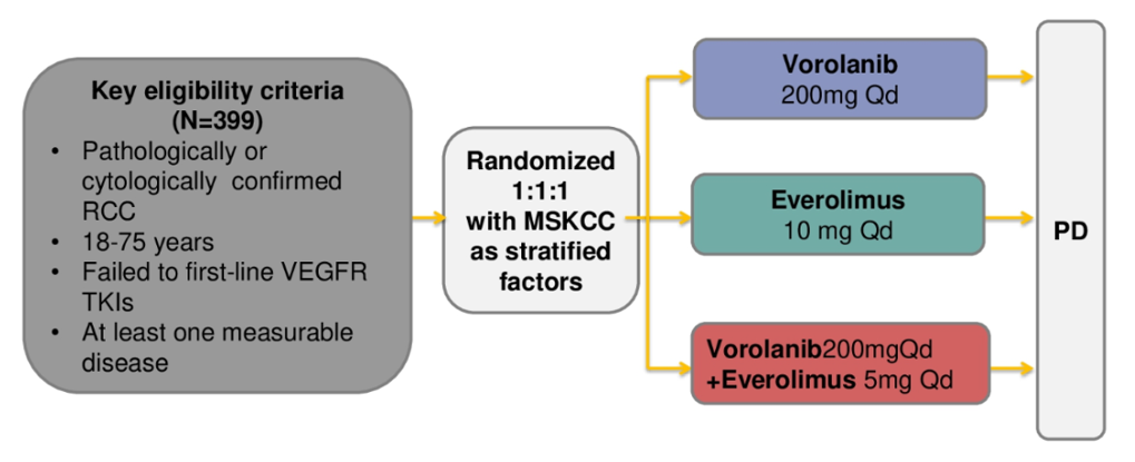 这项国内首个独立进行的大规模晚期肾癌靶向治疗随机对照双盲研究,于2017年在郭军教授领导下正式启动,从全国三十多家中心入组了399例VEGFR-TKI一线治疗失败的晚期肾细胞癌患者,按1:1:1比例随机分配至CM-082+依维莫司组、CM-082单药组、依维莫司单药组。