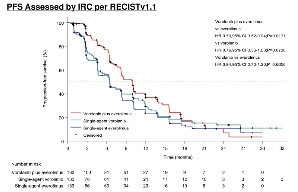 研究结果显示达到主要终点,CM-082+依维莫司组、CM-082组、依维莫司组由独立影像中心评估的中位PFS分别为10.0个月、6.4个月、6.4个月,CM-082+依维莫司相较于单药依维莫司的疾病进展或死亡风险下降30%(HR 0.70,95%CI:0.52~0.94,P=0.0171)。