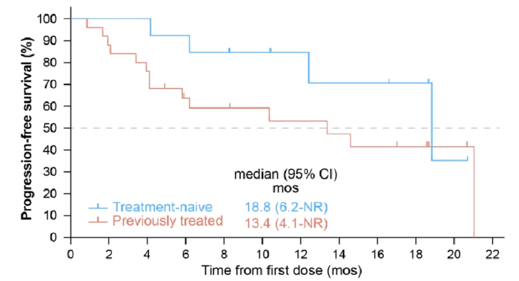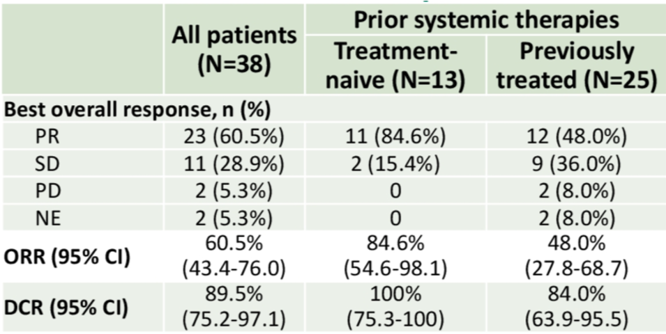 肾癌队列共入组38例晚期患者,多数(84.2%)患者既往接受过系统治疗,大部分存在肺(78.9%)、肝(15.8%)等内脏转移。中位随访18.8个月显示,ORR达到60.5%,其中一线治疗及后线治疗的ORR分别为84.6%和48%;DCR为89.5%,一线和后线治疗的DCR分别为100%和84.0%;中位PFS为NR,一线和后线治疗的PFS分别为NR和13.4个月。