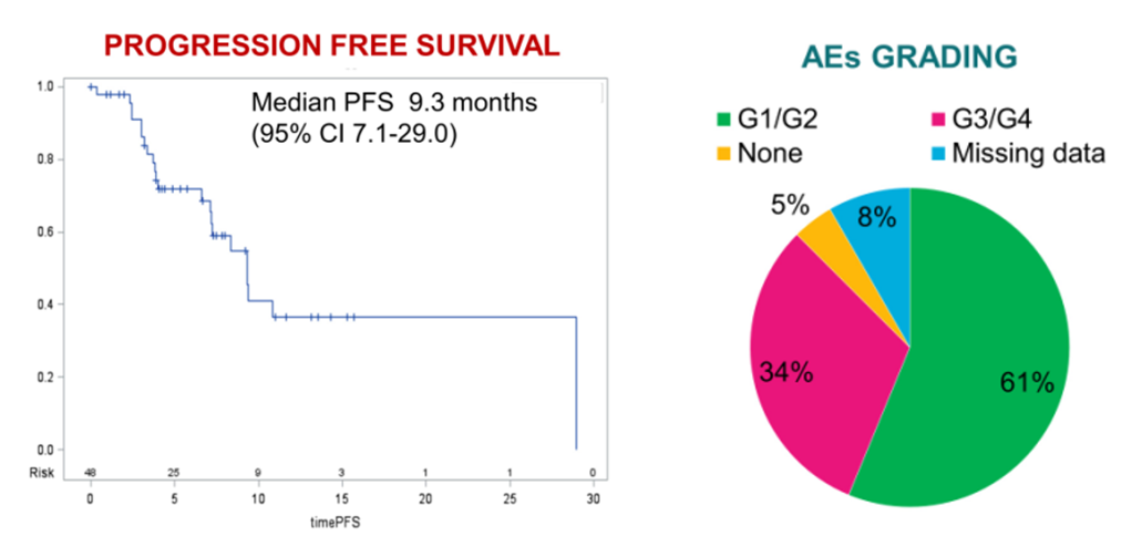 该研究入组了48例接受PD-1/L1辅助治疗或晚期一线治疗后发生进展的患者,其中34例(74%)接受过IO-IO一线治疗,8例(17%)IO-TKI治疗,4例(9%)单免辅助治疗。IMDC低、中、高危分别为26%、47%、13%。