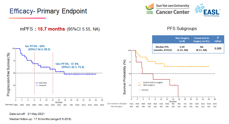 这项研究显示信迪利单抗+FOLFOX-HAIC的术前ORR达到44.8%,DCR 82.7%,转化切除率高达65.5%,其中15.8%达到pCR。长期随访数据显示全组患者中位PFS达到15.7个月,特别是接受手术治疗的患者,中位PFS预计超过24个月,治愈的可能大大增加。患者的OS数据还将进一步随访。作为第一个在国际大会上口头汇报的晚期肝癌转化治疗的前瞻性研究,该研究显示出极具潜力的初步结果,和历史数据相比极大改善了此类患者的预后,有望为局部晚期肝癌患者开创新的治疗模式,因此也引起了西方学者的关注,将该研究在大会新闻发布会环节进行重点推介。