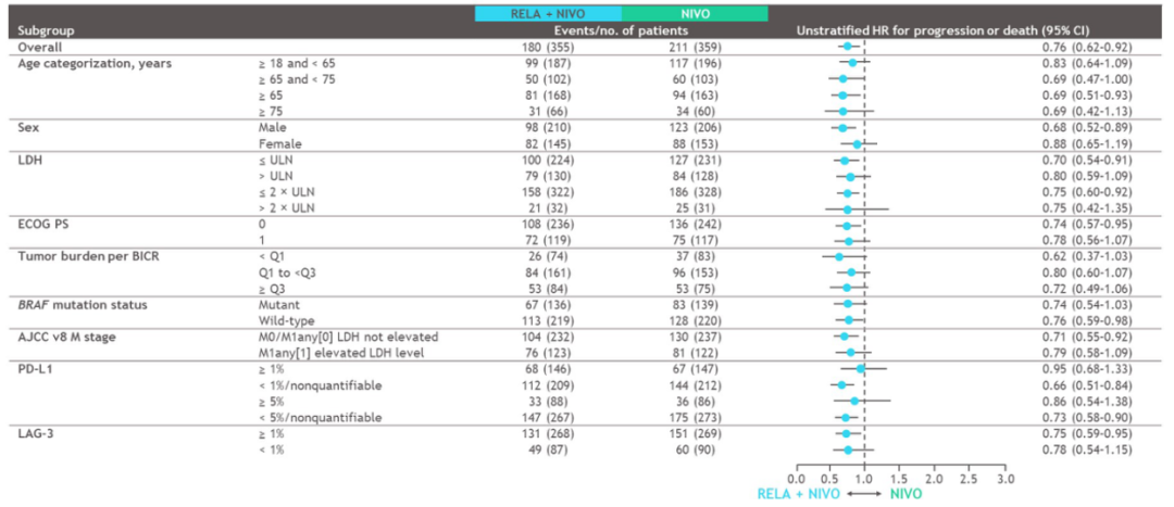 方法:既往未经治疗的晚期黑色素瘤患者按 1:1 随机接受 RELA 160 mg + NIVO 480 mg静脉输注 (IV) 或 NIVO 单药治疗 480 mg IV ,两组均为每 4 周给药一次,按 LAG-3 表达,PD-L1 表达、BRAF突变状态和 AJCC (v8) M 分期进行分层。主要终点是独立中心影像根据 RECIST v1.1 评价的无进展生存期 (PFS)。次要终点是总生存期和客观缓解率。预先指定亚组中的 PFS 和安全性是研究的额外目标。
