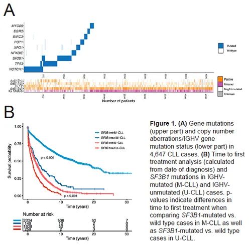 一般而言,在全基因组和/或外显子组测序中,超过10%的患者中可观察到有限数量的重复突变基因,而仅在一小部分患者(<5%)中可发现数百个突变基因事件。既往研究显示,若干常见突变基因已经证实与较短的首次治疗时间(TTFT)和总生存期的不良结局有关。