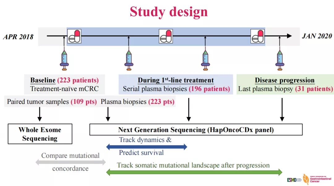 研究纳入2018年4月至2020年1月中山大学肿瘤防治中心一线治疗的223例mCRC患者(NCT228614)。患者血浆样本(含或不含肿瘤样本)在基线时和每6~8周采集一次并进行反应评估,直至发生疾病进展。使用HapOncoCDx面板检测ctDNA中的体细胞突变,其中包括378个癌症相关基因。使用HapOncoCDx WesPLus对肿瘤样本进行全外显子组测序。