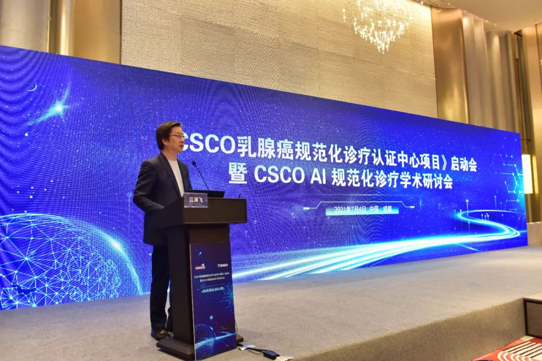 随着医疗人工智能不断深入临床,我国现有的医疗模式也正在随之改变。在肿瘤领域,据最新统计,我国每年新发肿瘤患者450万,为落实和推动国家卫健委和国家中医药管理局联合发布的《关于加强肿瘤规范化诊疗管理工作的通知》,实现《健康中国行动(2019-2030)》肿瘤防治理念,不断深化推行肿瘤规范化诊疗,提升5年生存率的目标, 2021年7月4日,由中国临床肿瘤学会(以下简称CSCO)乳腺癌专家委员会主办的《CSCO乳腺癌规范化诊疗认证中心项目》启动会暨CSCO AI规范化诊疗学术研讨会在成都如期举行。