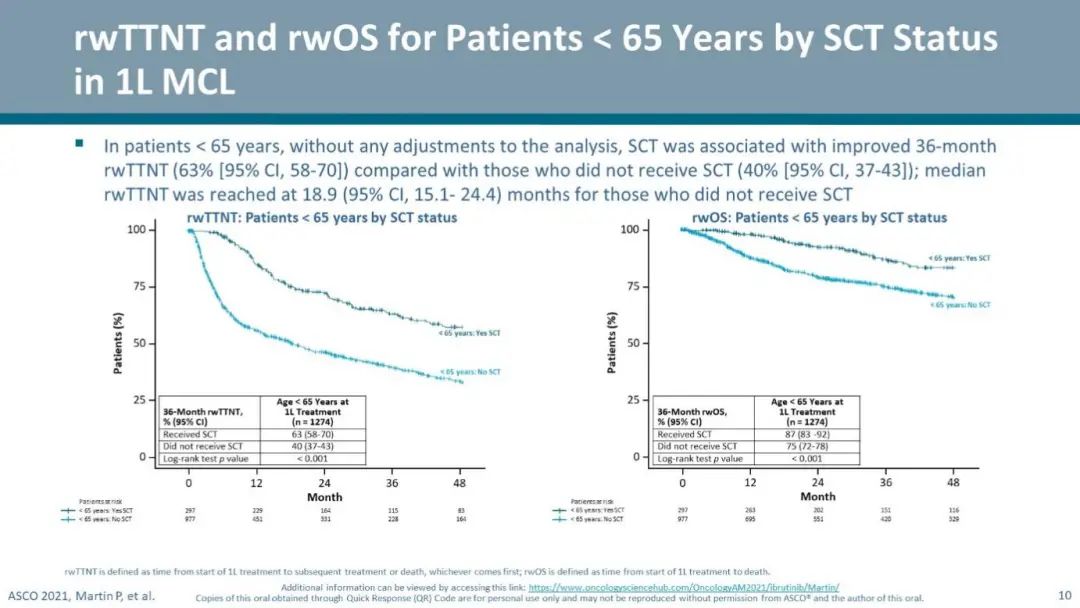 多变量分析显示:年龄≥ 65岁,ECOG评分≥ 2分,LDH/ULN ≥ 1,WBC ≥ 10×109/L,大肿块 (≥ 5 cm),母细胞样/多形性形态与较短的TTNT和OS相关;MR是与较长TTNT和OS的独立相关因素。对< 65岁,仍存活并且一线治疗6个月内 “适合SCT”的患者中,SCT治疗患者 vs. 未SCT患者之间的36个月TTNT和OS无明显差异,分别为:65% vs. 59%,86% vs. 85%。