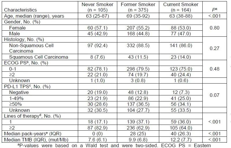 研究方法:该研究纳入了2013年4月至2020年9月就诊于丹娜法伯癌症中心及布里格姆妇女医院接受免疫检查点抑制剂单药治疗的晚期非小细胞肺癌患者,收集患者年龄、性别、吸烟史、治疗史、PS评分等临床病理学特点。吸烟史包括从不吸烟(吸烟量<100支)、既往吸烟(戒烟>12 月)以及当前吸烟(戒烟<12 月)。PD-L1检测平台包括22C3、SP263、E1L3N等。