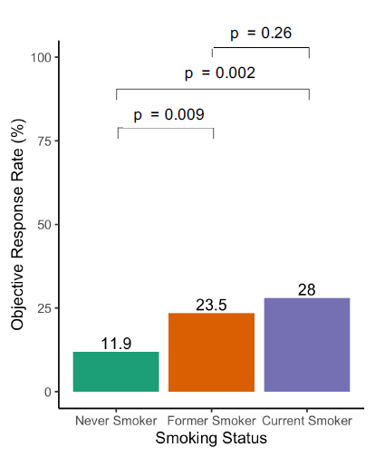 第三,治疗线数不均衡。在不吸烟患者中,仅有17.1%的患者一线接受免疫治疗,而在既往吸烟及当前吸烟的患者中,这一比例分别为37.1%和36%。在肿瘤治疗过程中,往往越到后线,患者治疗难度越大,因为肿瘤细胞已经成为多线耐药细胞,因此,对于免疫治疗响应较差也在情理之中。