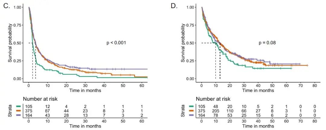 PFS:从不吸烟者相较于既往吸烟者PFS更短(2.07 m vs. 3.65 m,P=0.01),与当前吸烟者相比,PFS同样更短(2.07 m vs 3.68 m,P<0.001)。OS:从不吸烟者相较既往吸烟者OS更短(9.9 m vs.12.9 m,P=0.23),与当前吸烟者相比,OS同样更短(9.9 m vs. 13.2 m,P=0.10)(图3)。