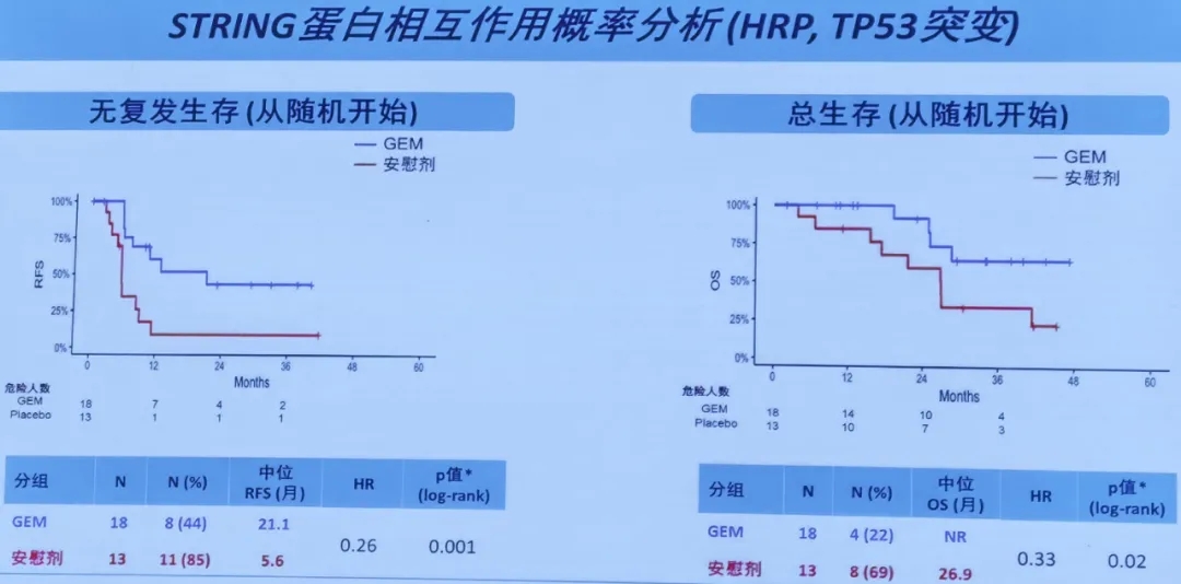 转化研究:HRP/P53突变亚组的STRING蛋白相互作用概率分析显示,从随机分组开始,GEM治疗组相比安慰剂组在RFS(21.1个月vs 5.6个月)与OS(NR vs 26.9个月)有显著改善。