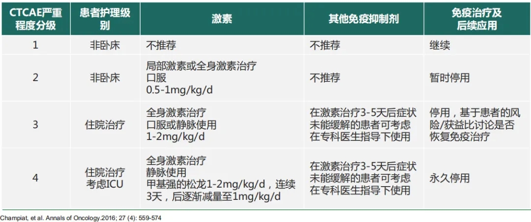 irAEs的处理原则,核心是糖皮质激素。大多数irAEs可以通过暂停给药±皮质类固醇激素得以控制和逆转,少数需加用免疫抑制剂和终生停药。