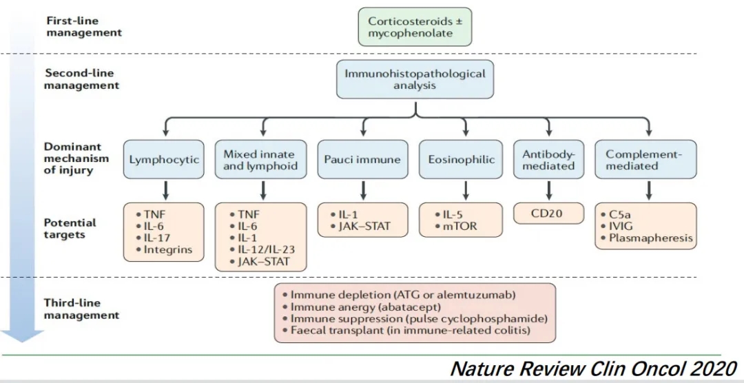 了解irAE的免疫病理学,对诊断和个体化治疗难治性irAE起了重要的作用。每一种irAE都有相应的病理生理机制,尽可能的取得活检或血检,抽取细胞因子,找出irAE的相关机制,用来选择相应的个体化治疗措施,可取得更好的疗效。