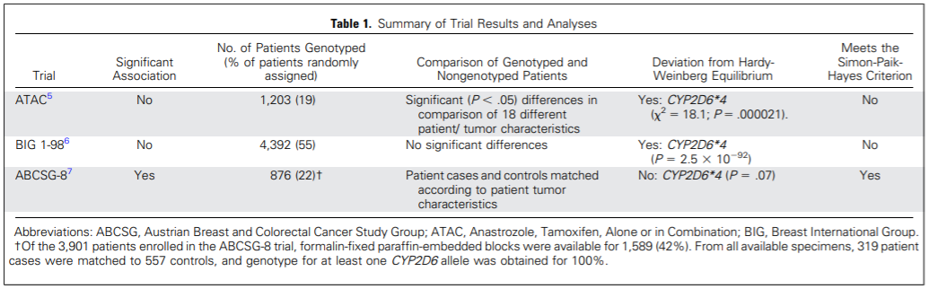 [2]Goetz MP, Ratain M, Ingle JN. Providing Balance in ASCO Clinical Practice Guidelines: CYP2D6 Genotyping and Tamoxifen Efficacy. J Clin Oncol. 2016;34(32):3944-3945. doi:10.1200/JCO.2016.68.5214