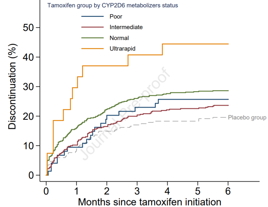CYP2D6缓慢、中间、正常和超快代谢型女性的6个月TAM停药率分别为 25.7%、23.6%、28.6% 和 44.4%。