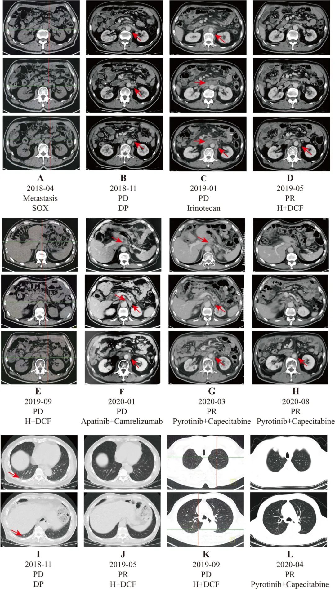 患者病情进展后行基因检测。NGS测序结果示HER2基因拷贝数增加,HER2基因未发生突变。基于新型HER2靶向药物吡咯替尼与卡培他滨联合治疗可用于曲妥珠单抗耐药的乳腺癌患者。因此,患者于2020年1月行吡咯替尼联合卡培他滨治疗。三个周期后,腹部CT扫描显示腹膜淋巴结PR。四个周期后,胸部CT扫描显示肺结节消失。与此同时,CA199和CEA呈稳步下降趋势。2020年8月腹部CT示腹膜后淋巴结PR。患者对吡咯替尼治疗耐受良好,未观察到不良事件。PFS超过11个月。