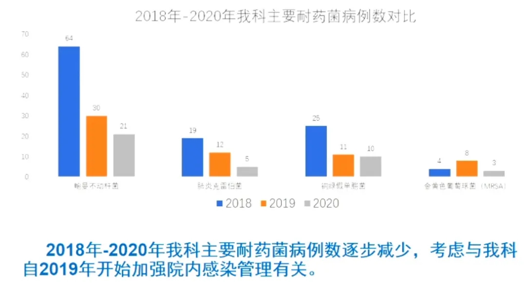 ICU抗感染是永恒的话题,防院感应始终渗透至ICU每一项工作中。张琳琳教授最后介绍,从2018到2020年,其所在重症科的主要耐药菌病例数逐步减少,考虑到这些结果与科室自2019年开始加强院内感染管理有关。