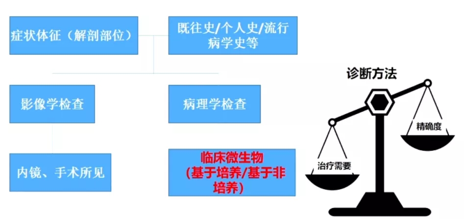 确定病原微生物的策略:基于患者的临床体征、感染部位,结合病史进行初步判断,然后进行影像学检查和病理学检查结果,最终确定病原。病原微生物诊断策略需要平衡治疗需要和精确度。