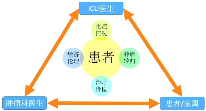 肿瘤患者是否进入重症科,ICU医生、肿瘤科医生、患者或/及其家属三方充分沟通,从患者的重症情况、肿瘤可能转归、治疗价值及经济负担与伦理四个方面综合评估。发生重症风险高、危重状态、特殊情况的患者可收治,准确评估病情,尽可能计划内转入ICU。