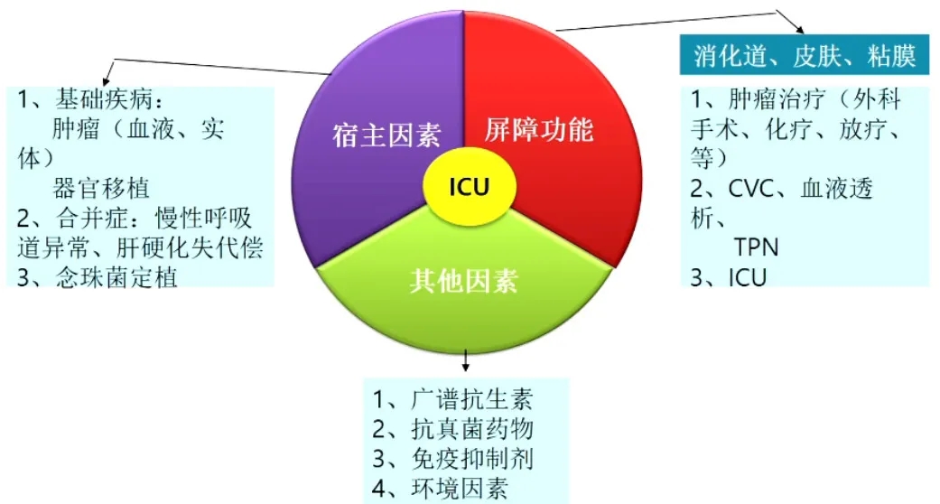 屏障功能破坏:肿瘤治疗、中心静脉导管插管、血液透析、全胃肠外营养、ICU等所致消化道、皮肤、粘膜的屏障功能破坏;