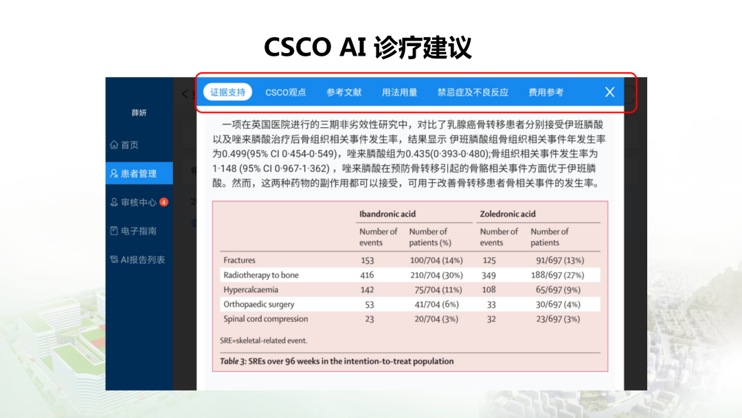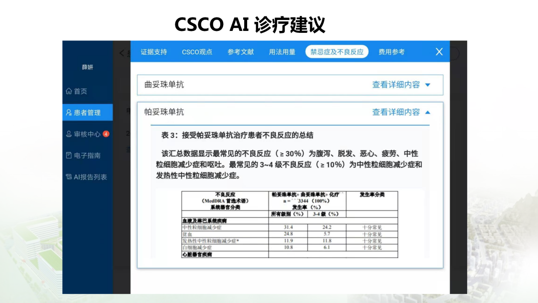 CSCO AI对管理患者提供了极大的帮助。第一,医生书写的病历是否完整、诊疗思路是否正确在这个数据库中一目了然,有利于指导下级医生、管理患者,提高医疗质量。第二,医生可以使用CSCO AI系统提供的乳腺癌治疗科普和不良反应管理视频,提供便利的患者教育。第三,CSCO AI也是个很好的医患沟通平台,让患者的困惑可以及时得到医生的解答,增加医患沟通,助力肿瘤治疗。