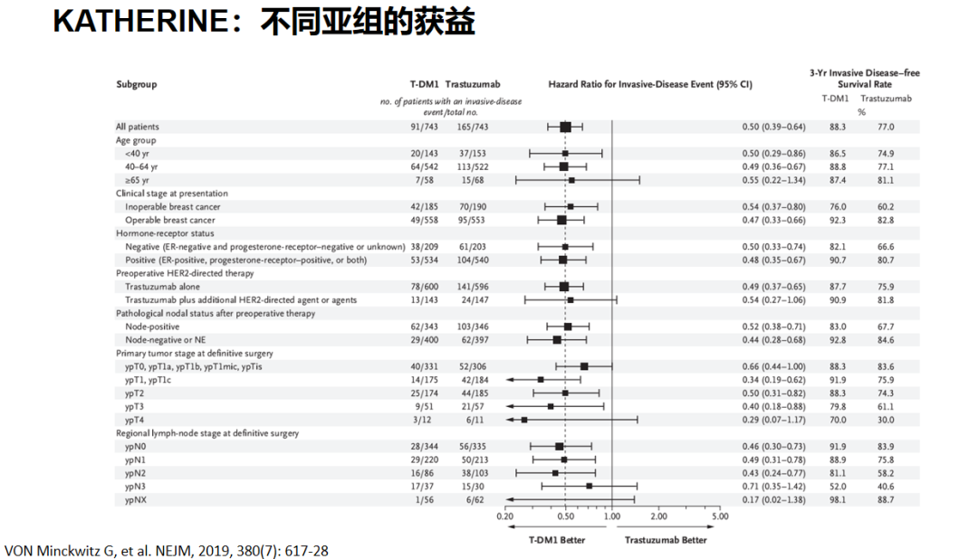 KATHERINE研究结果表明,无论患者是采用曲妥珠单抗单靶向还是含曲妥珠单抗的双靶新辅助治疗,如果仍有残存病灶,都能从术后T-DM1治疗中获益。