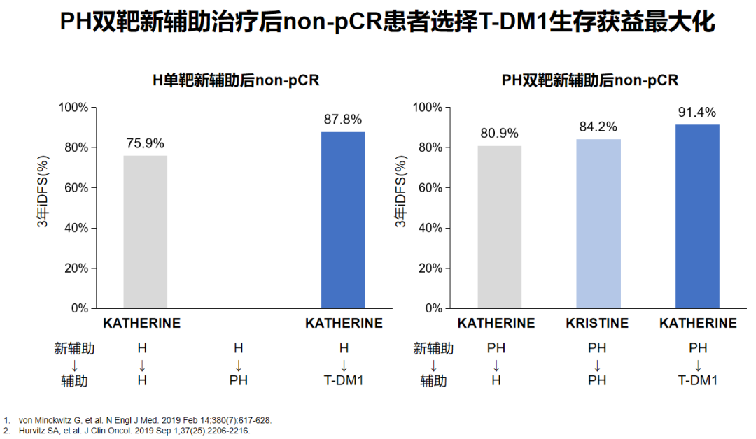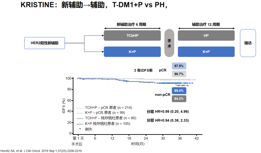 KRISTINE研究探索了多西他赛+卡铂+曲妥珠单抗+帕妥珠单抗(新辅助治疗)序贯曲帕双靶(辅助治疗),对比T-DM1+帕妥珠单抗(新辅助治疗)序贯T-DM1+帕妥珠单抗(辅助治疗)在HER2阳性乳腺癌中的治疗效果。结果显示,PH双靶新辅助治疗后non-pCR患者,选择T-DM1生存获益最大(3年iDFS率为97.5%)。