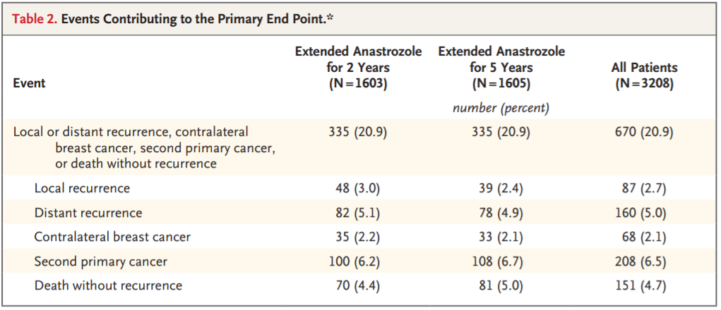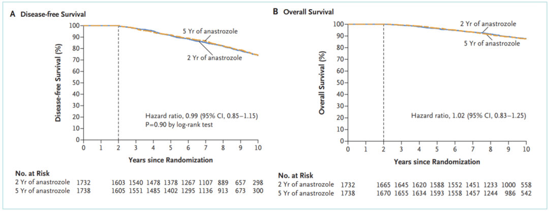 主要终点为无病生存期(DFS),定义为随机分组至局部或远处复发、对侧乳腺癌、第二原发癌、死亡。对随机分组2年后(即2年组治疗结束时)未退出研究且未复发患者进行主要终点分析(共3208例,其中2年组1603例,5年组1605例)。次要终点包括总生存期(OS)、对侧乳腺癌、第二原发癌和首次临床骨折发生时间等。