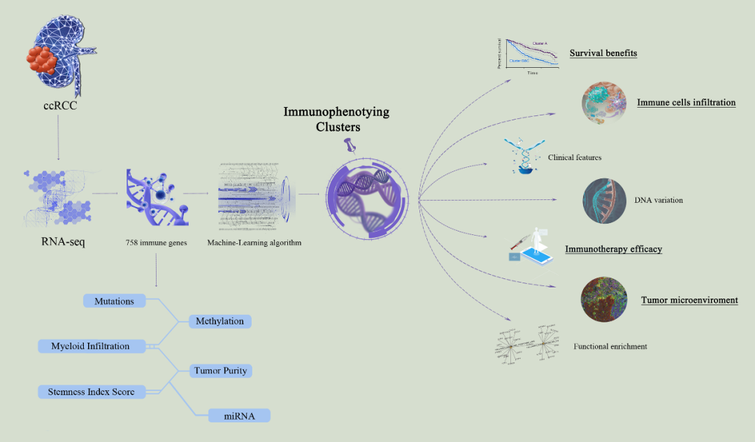肾透明细胞癌(clear cell renal cell carcinoma, ccRCC)是最常见的、恶性程度较高的肾癌病理类型,尽管分子靶向治疗和免疫治疗的发展干预了肾癌病理生理发生、发展的关键靶点,但并非是以患者为中心的精准个体化治疗。因为每个患者的肿瘤组织的生物学特征及其对药物的敏感性呈高度异质性,在同一组织学分型的不同患者中,其生物学特征和靶向/免疫治疗效果均存在显著的差异。因此,如何通过分子生物学特征,将晚期肾癌患者进一步按照免疫浸润情况分型,为晚期肾癌患者筛选合适的治疗方案,进一步提高治疗效果,实施“精准治疗”和“同病异治”的治疗策略,是临床上亟待解决的问题。