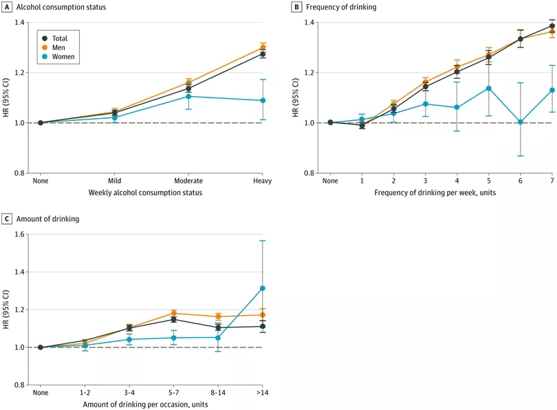 胃肠道肿瘤风险随饮酒频率呈剂量依赖性线性增加(对于每天饮酒的个体,aHR 1.39;95%CI:1.36~1.41)(图1,表1)。