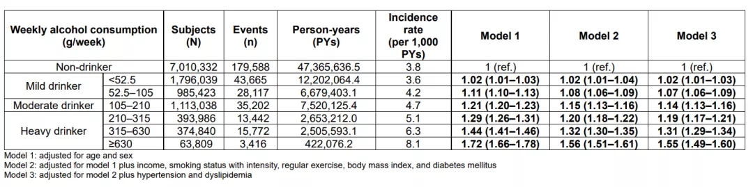 与不饮酒者相比,轻度饮酒者(调整后的风险比[aHR]为1.04;95%CI:1.03~1.05)、中度饮酒者 (aHR 1.14;95%CI:1.12~1.15) 和重度饮酒者 (aHR 1.28;95%CI:1.26~1.29) 患胃肠道肿瘤的风险更高(图1,表1,表2)。