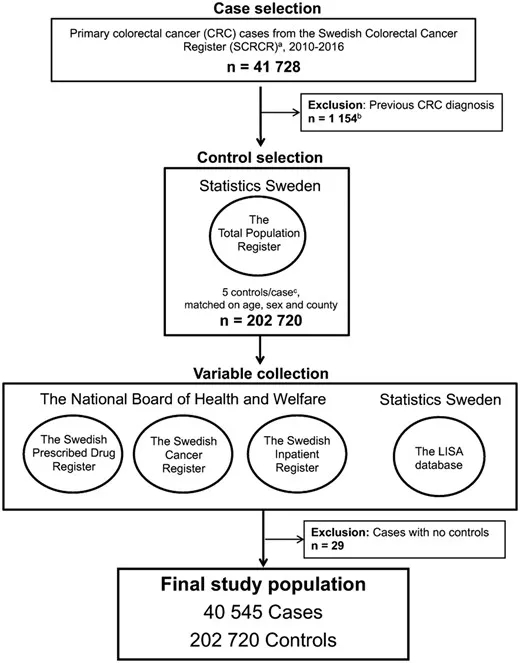 该分析包括来自瑞典大肠癌登记处的40 545例结直肠癌患者(平均诊断年龄71.9岁;男性占52.9%)。研究人员根据年龄、性别和地区,按1:5的比例与之进行匹配,纳入202 720名无癌者作为对照。见图1。