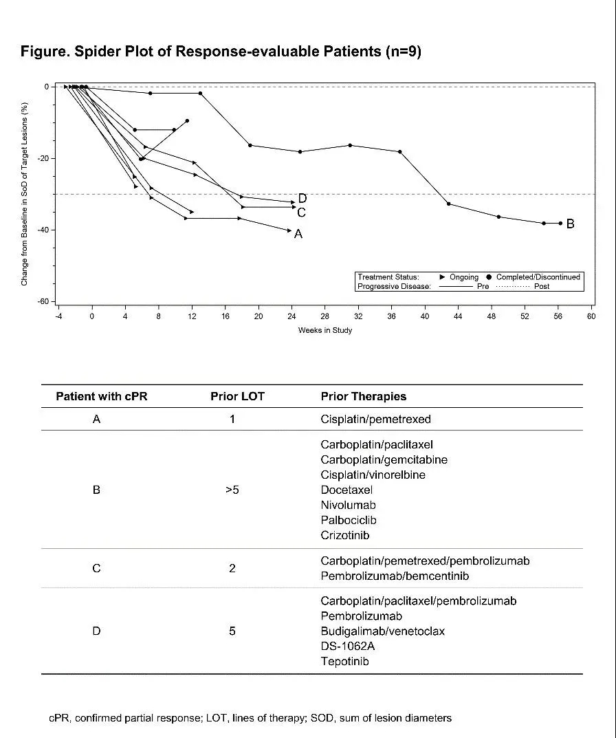 截止2021年3月29日,16例MET 14外显子跳跃突变的NSCLC患者接受Amivantamab治疗,既往治疗的中位数为2,7例患者既往接受过治疗,包括先前使用克唑替尼(n=3)和卡马替尼(n=1)治疗、tepotinib (n=2) 和抗MET抗体(n=1)。给予Amivantamab治疗后,目前至少9例患者得到疗效评估,在每一位患者都有抗肿瘤活性体现,4例已经达到部分缓解(PR)(包括既往接受过抗MET治疗在内),其中3例持续治疗超过6个月,1例患者治疗超过12个月后终止。