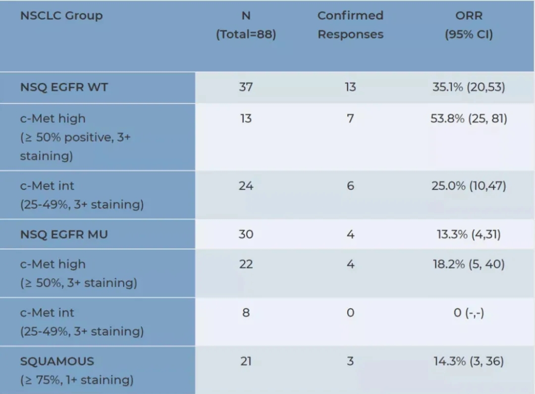 该药在c-MET高表达的非鳞癌而且无EGFR突变患者中有效率最高,达到53.8%,在鳞癌和EGFR突变患者的有效率均低于20%。这项结果其实也显示了MET靶点异常的多样性,而且在此之前有好多种药物包括罗氏/基因泰克公司的Onartuzumab、礼来公司的Emibetuzumab、安进公司的Rilotumumab以及Tivantinib和Cabozantinib都是在二期或者三期临床试验中折戟沉沙,由于无法找到合适的人群而不再有新的临床研究。不过另外几个TKI,如Tepotinib和Capmatinib以及我国的原研药物赛沃替尼纷纷上市,由于选择定位在MET 14突变而取得良好疗效。