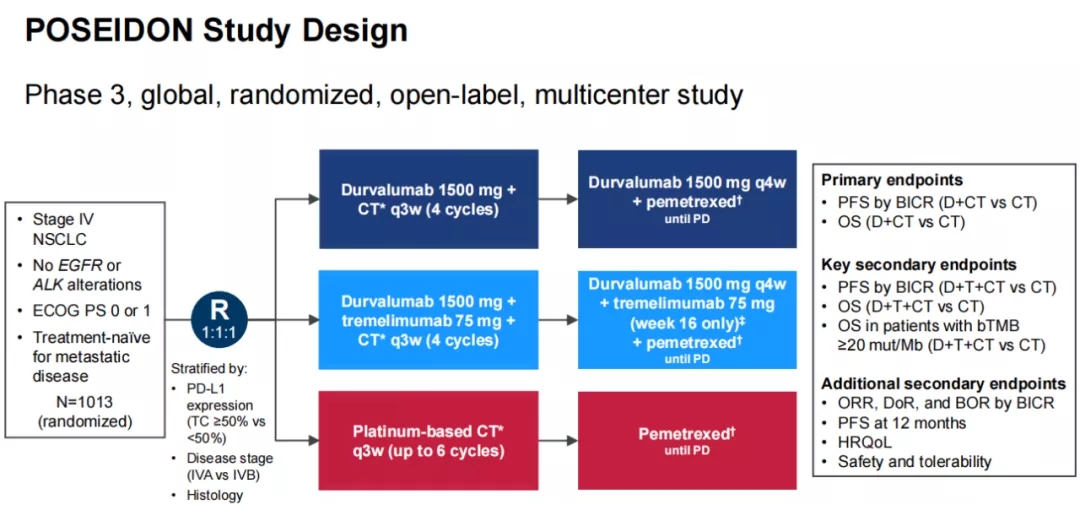 POSEIDON试验(NCT03164616)是一项全球多中心、随机、开放标签的III期临床研究,共纳入1013名驱动基因阴性、ECOG评分0-1分的初治晚期非小细胞肺癌患者,1:1:1随机分为3组。