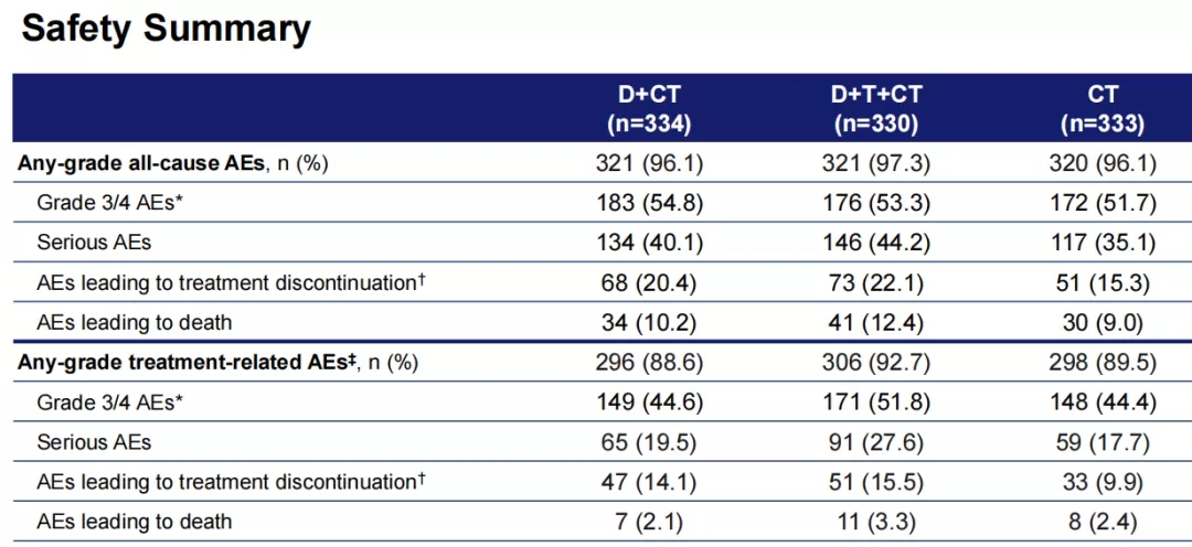 各组均未观察到预期外的不良反应,大多数不良反应由化疗引起。D+CT组,D+T+CT组及CT组中由于各种原因引起的各级不良反应(AEs)发生率分别为96.1%、97.3%和96.1%;3-4级不良反应发生率分别为54.8%、53.3%和51.7%;严重不良反应发生率分别为40.1%、44.2%和35.1%。三组间由于不良反应导致的治疗中断率(20.4%、22.1%和15.3%)及不良反应导致的死亡率(10.2%、12.4%和9.0%)相似。