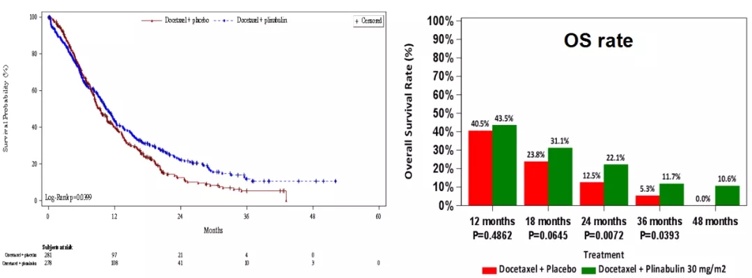 24个月OS率(22.1% vs 12.5%)、36个月OS率(11.7% vs 5.3%)几乎翻倍,48个月OS率分别为10.6%和0%,即普那布林+多西他赛使10.6%的患者生存超过4年,显示出持久的抗癌益处,相比之下单药多西他赛仅有5.3%患者生存期在3-4年之间。