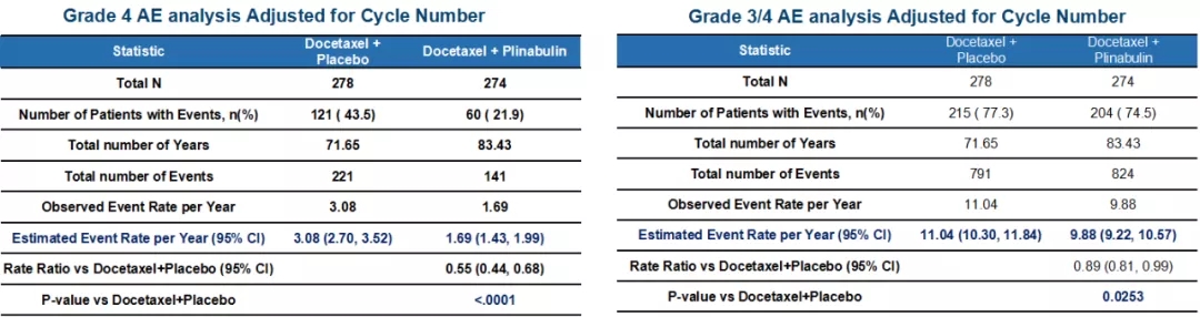 普那布林通过显著降低4级中性粒细胞减少症来保护骨髓(P<0.0001),常见的中性粒细胞减少副反应的发生率仅有5.13%,低于多西他赛单药发生率(33.58%)。